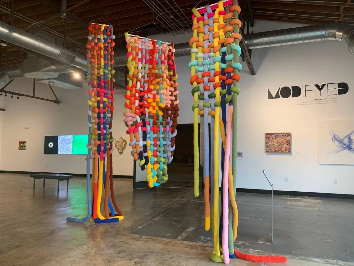 Sharon Dowell, whose work can be found all over town from Camp North End to South End, curated the Modifyed exhibit. “The show idea was taking smaller components to make a bigger whole, (featuring) artists working with non-traditional materials,” Dowell said. “Kat’s work is so eye-catching and vibrant, and to blow up the scale of mending and weaving is such a cool idea.”
